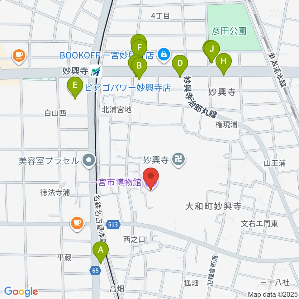 一宮市博物館周辺のファミレス・ファーストフード一覧地図