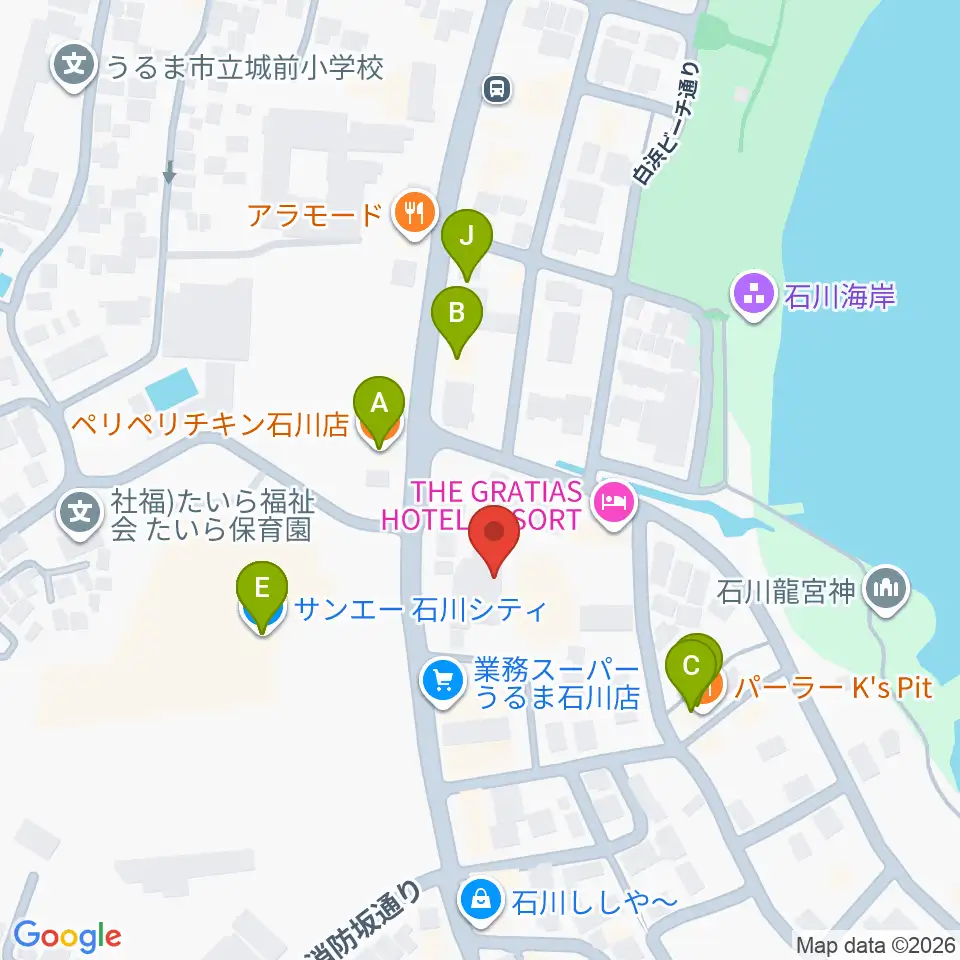 うるま市立石川歴史民俗資料館周辺のファミレス・ファーストフード一覧地図