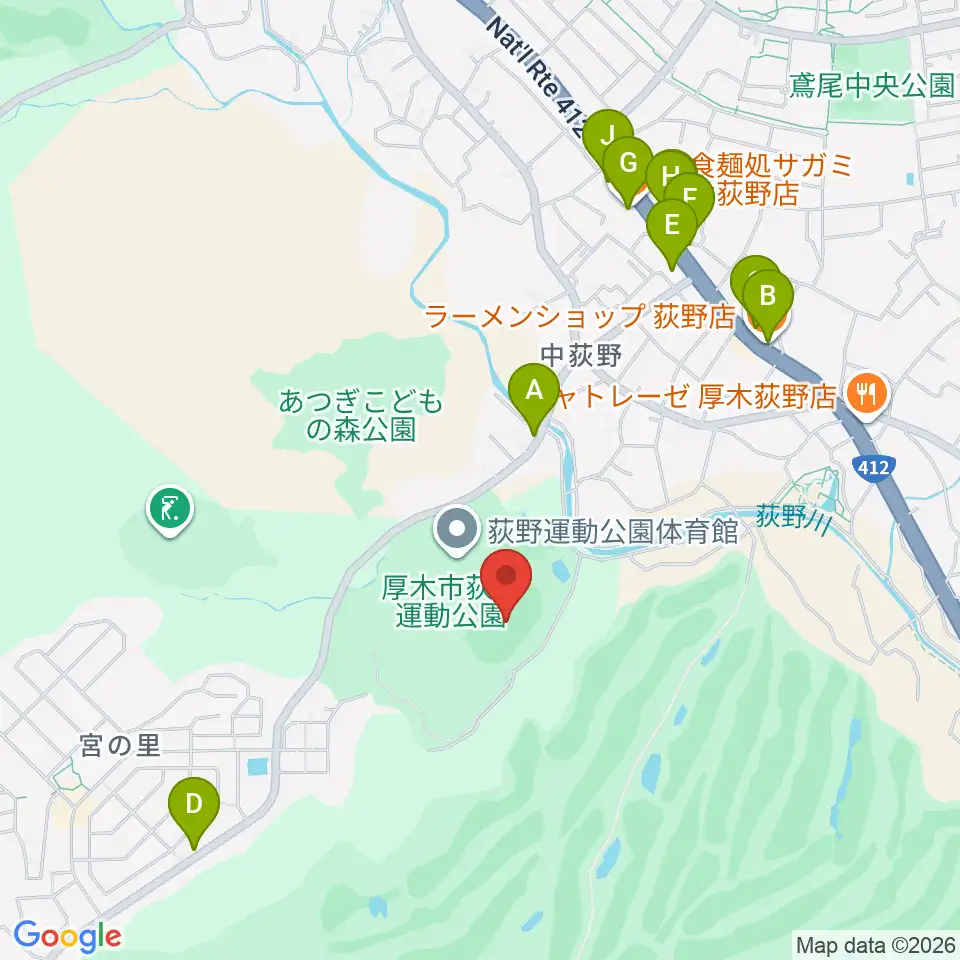 荻野運動公園競技場周辺のファミレス・ファーストフード一覧地図