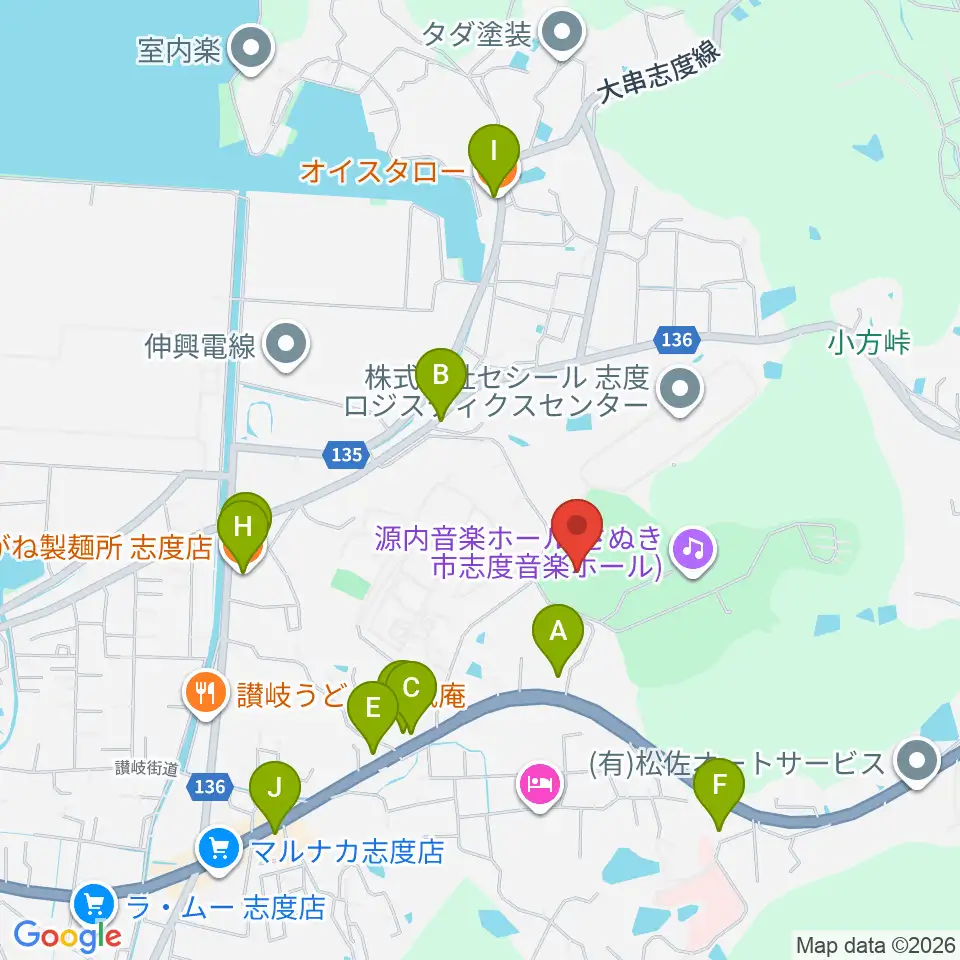 志度総合運動公園野球場周辺のファミレス・ファーストフード一覧地図