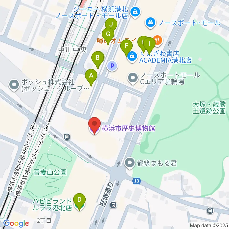横浜市歴史博物館周辺のファミレス・ファーストフード一覧地図