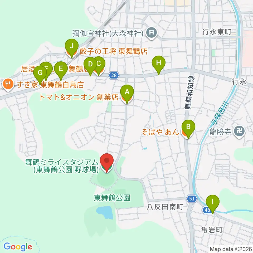 舞鶴ミライスタジアム周辺のファミレス・ファーストフード一覧地図