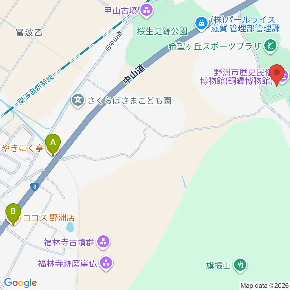 野洲市歴史民俗博物館周辺のファミレス・ファーストフード一覧地図