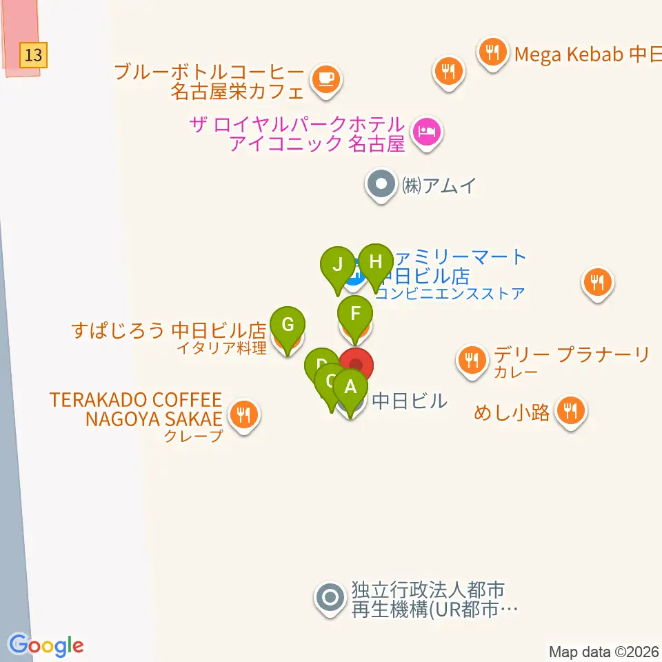 中日ホール周辺のファミレス・ファーストフード一覧地図
