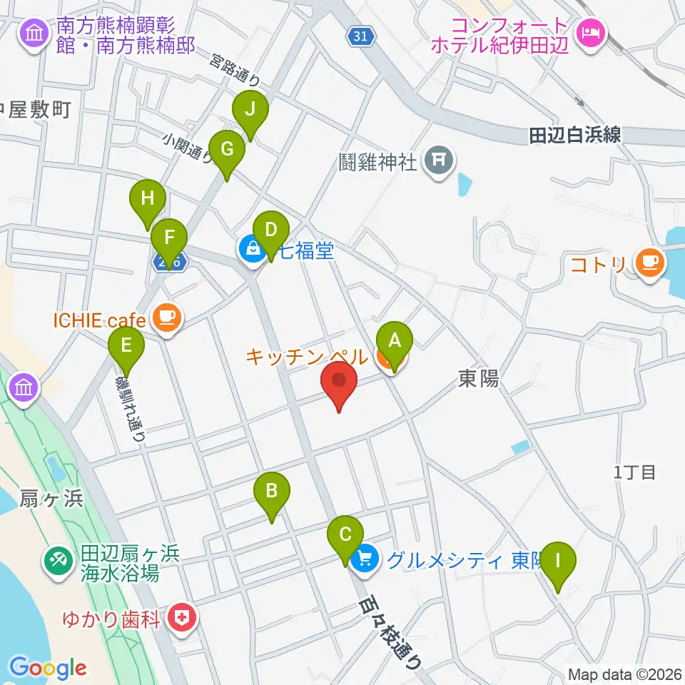田辺市立歴史民俗資料館周辺のファミレス・ファーストフード一覧地図