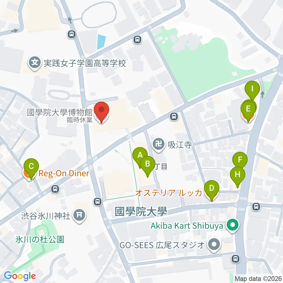 國學院大學博物館周辺のファミレス・ファーストフード一覧地図