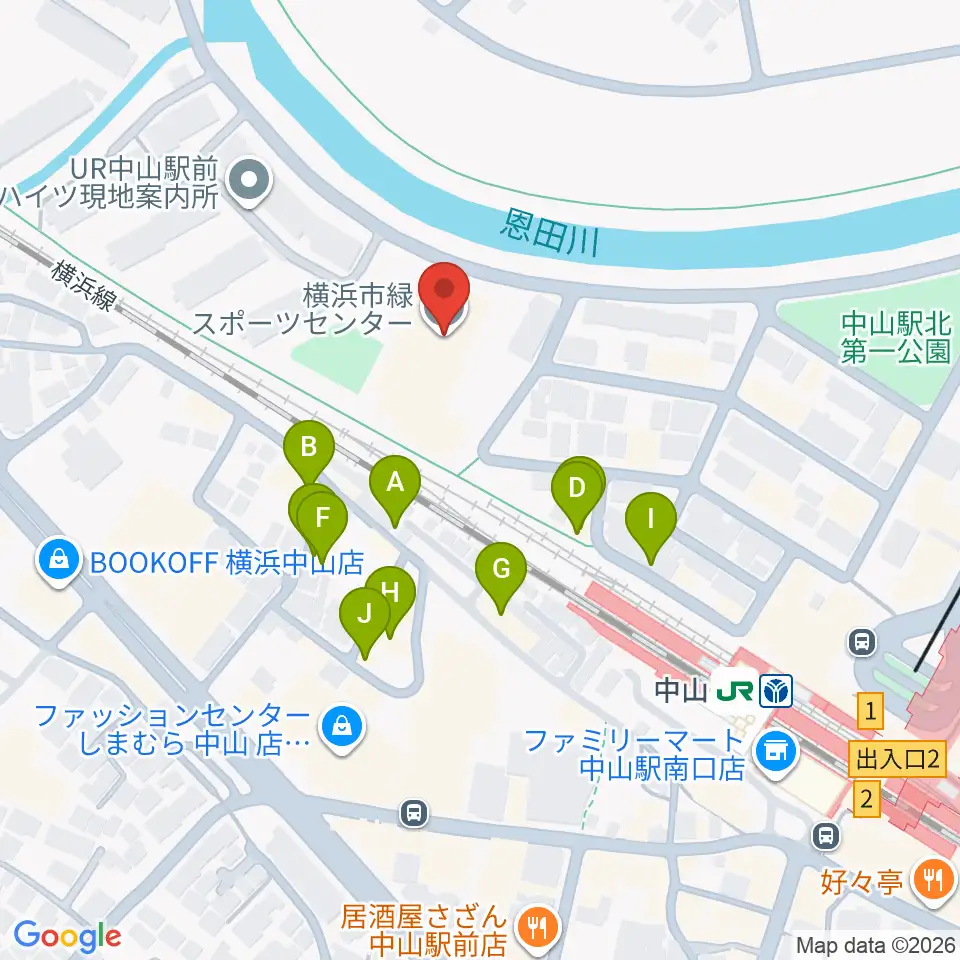 横浜市緑スポーツセンター周辺のファミレス・ファーストフード一覧地図
