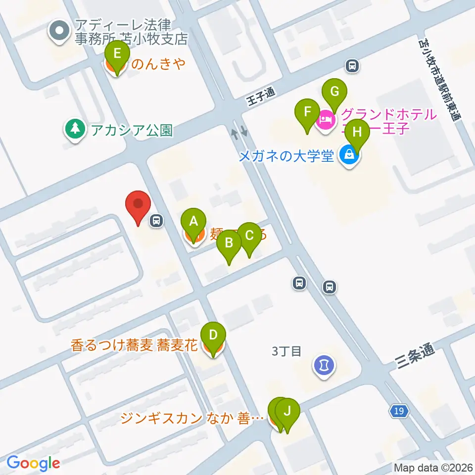 苫小牧エルキューブ周辺のファミレス・ファーストフード一覧地図