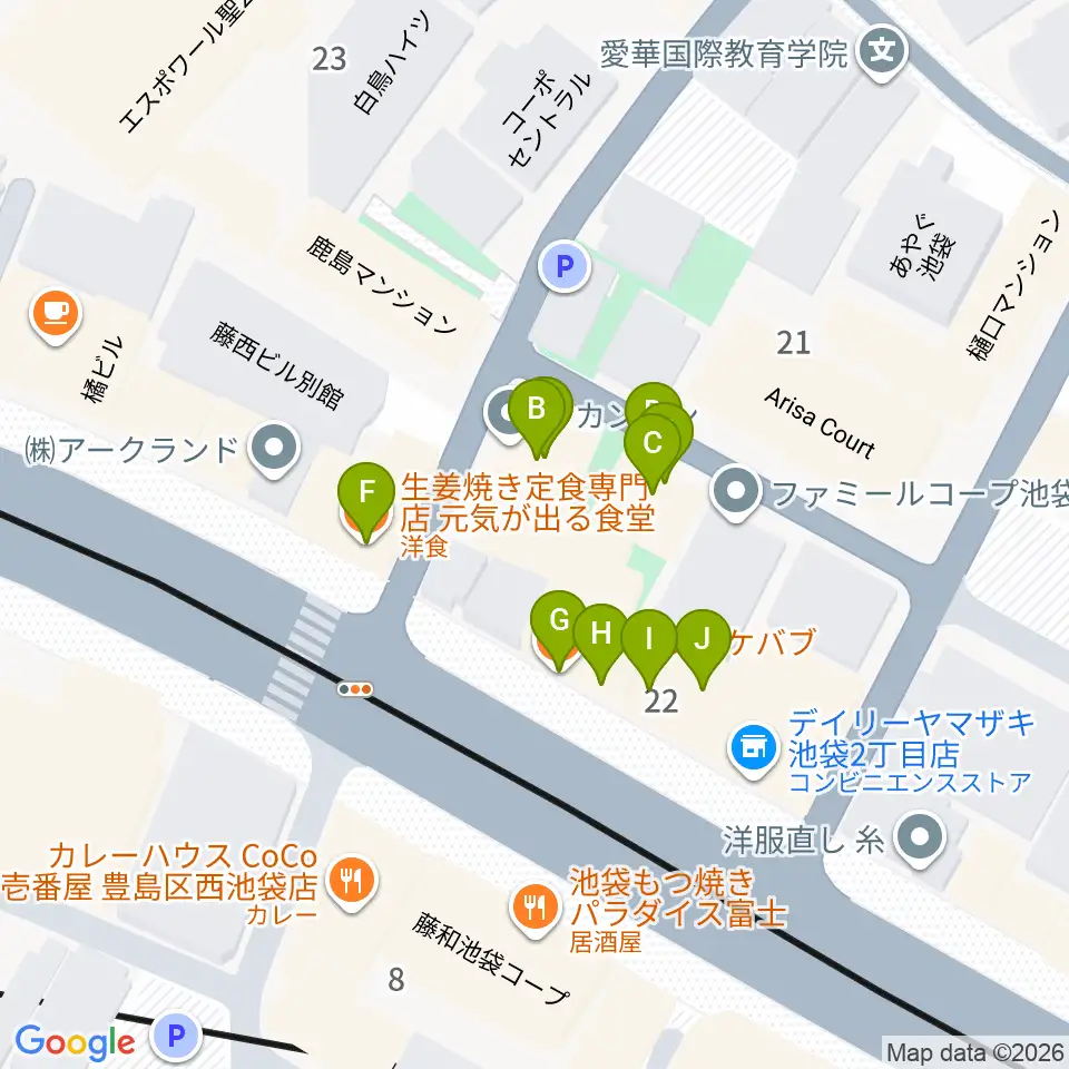 池袋バレルハウス周辺のファミレス・ファーストフード一覧地図