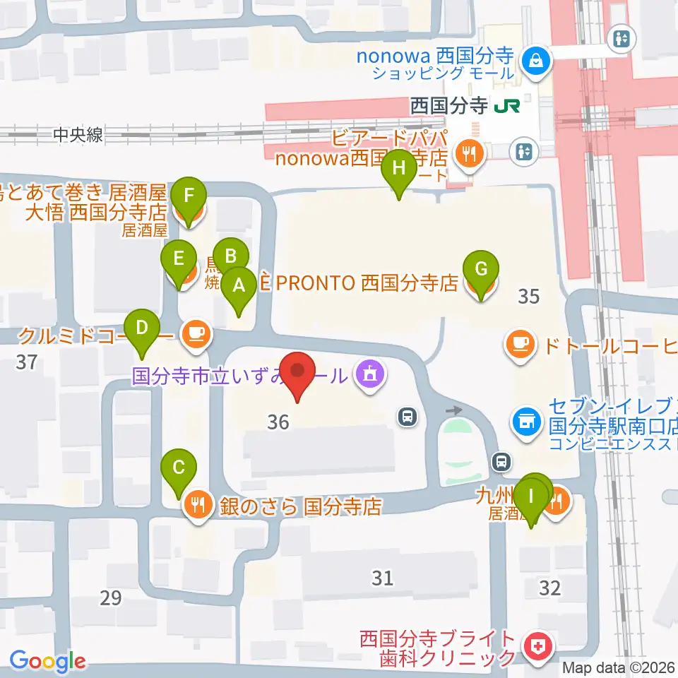 国分寺市立いずみホール周辺のファミレス・ファーストフード一覧地図
