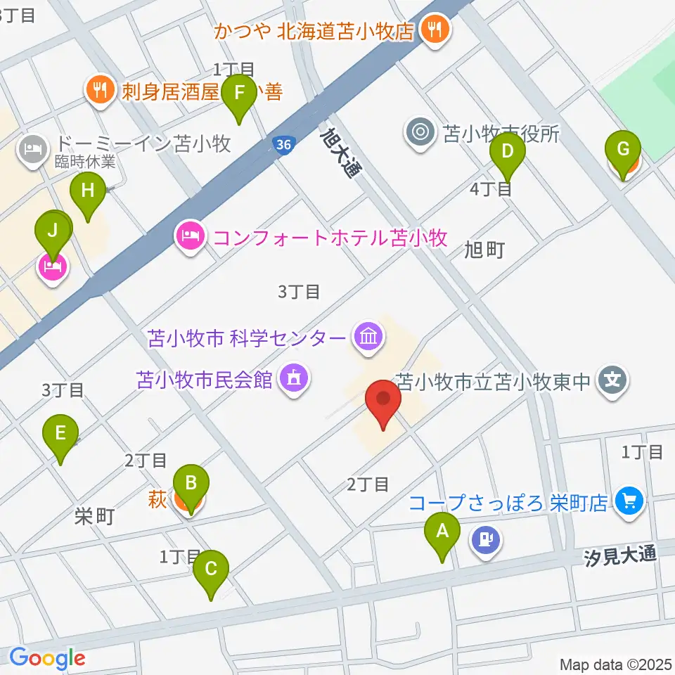 苫小牧市文化会館周辺のファミレス・ファーストフード一覧地図
