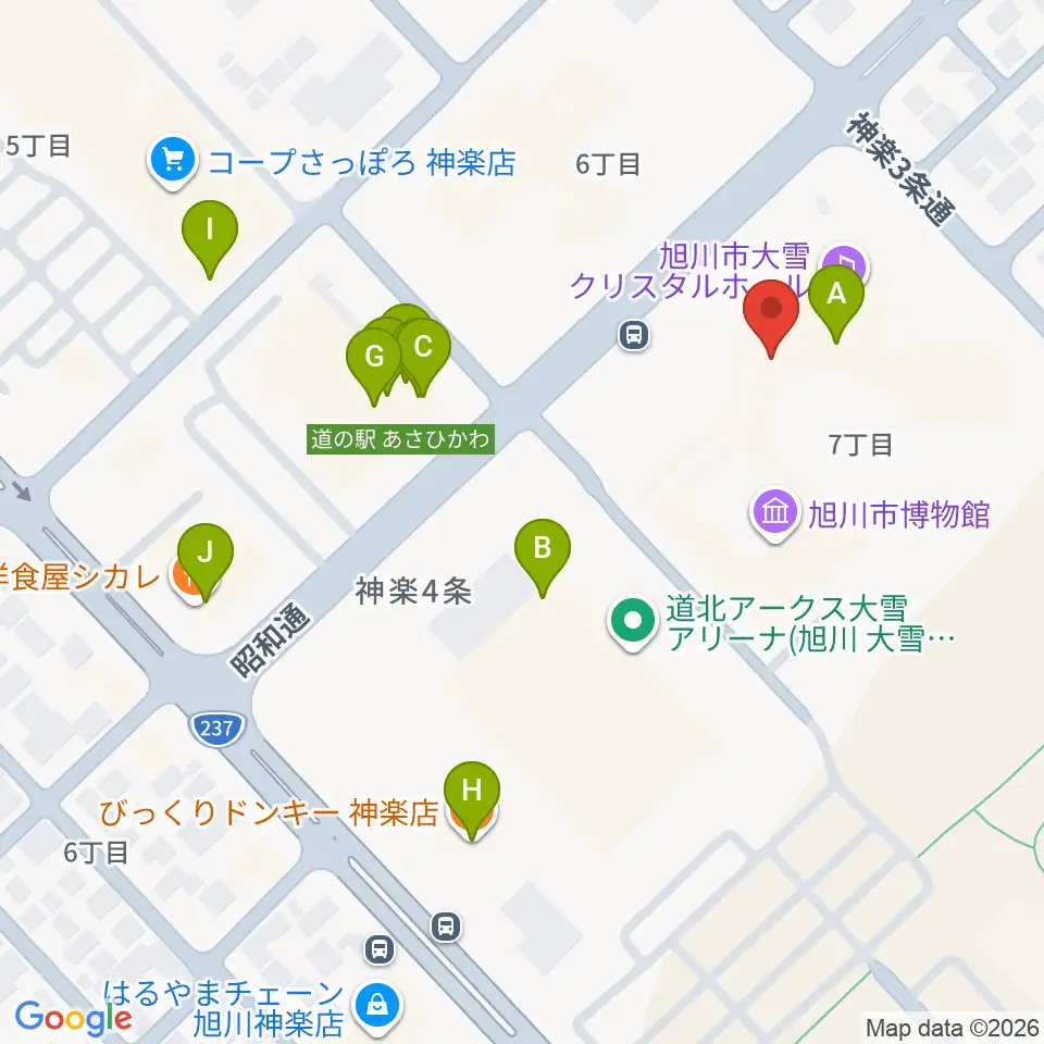 旭川市大雪クリスタルホール周辺のファミレス・ファーストフード一覧地図