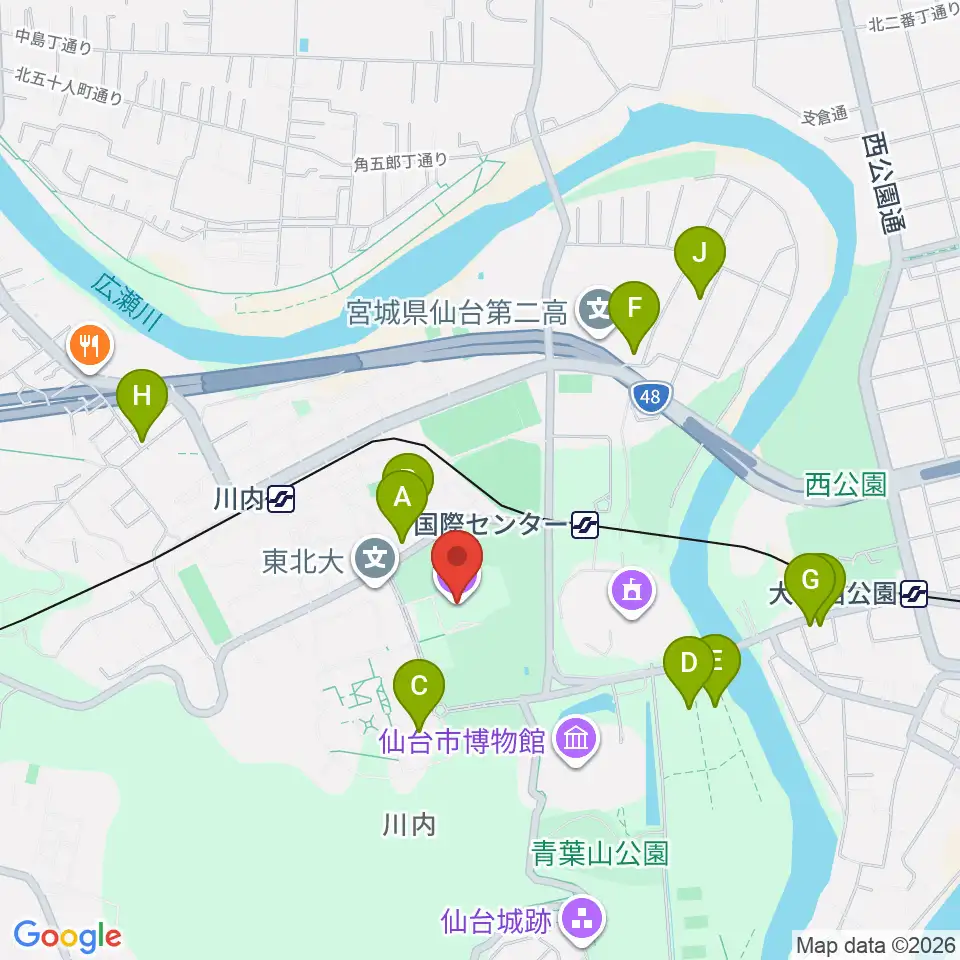 東北大学百周年記念会館 川内萩ホール周辺のファミレス・ファーストフード一覧地図