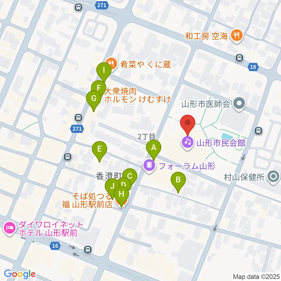 山形市民会館周辺のファミレス・ファーストフード一覧地図
