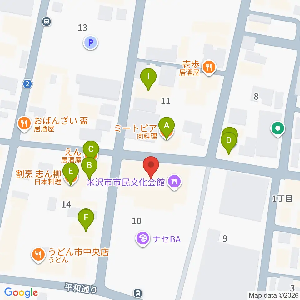 米沢市市民文化会館周辺のファミレス・ファーストフード一覧地図