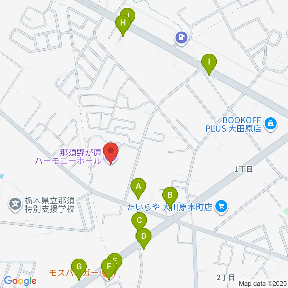 那須野が原ハーモニーホール周辺のファミレス・ファーストフード一覧地図
