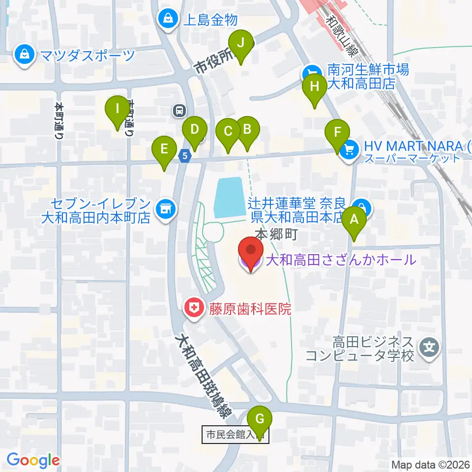 大和高田さざんかホール周辺のファミレス・ファーストフード一覧地図