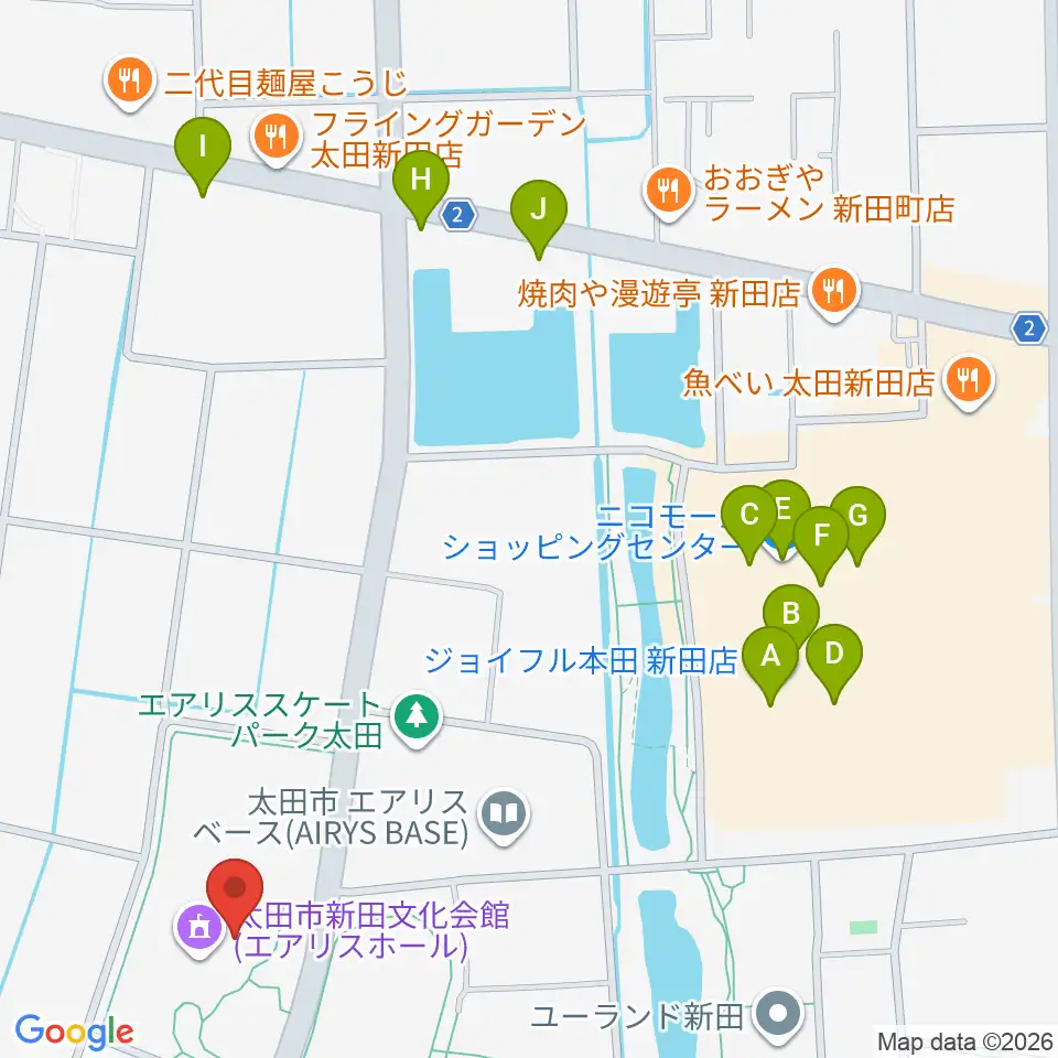 太田市新田文化会館エアリスホール周辺のファミレス・ファーストフード一覧地図