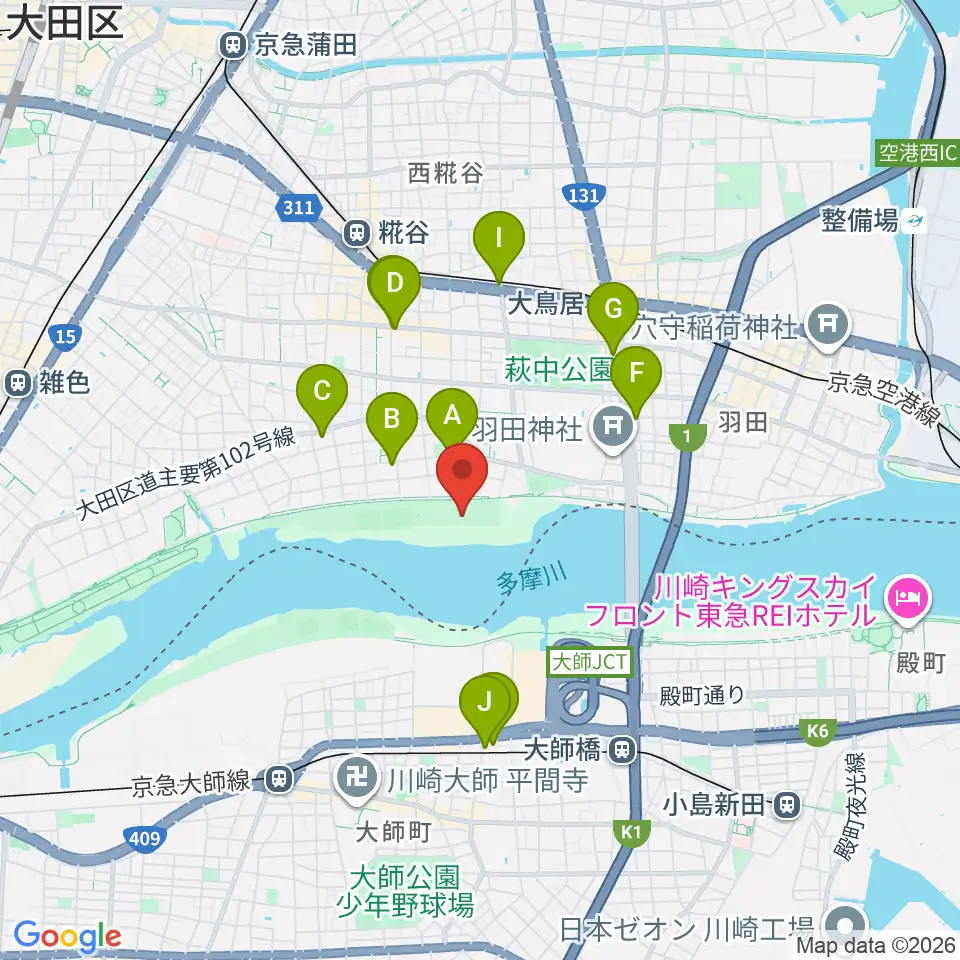 多摩川大師橋緑地周辺のコンビニエンスストア一覧地図