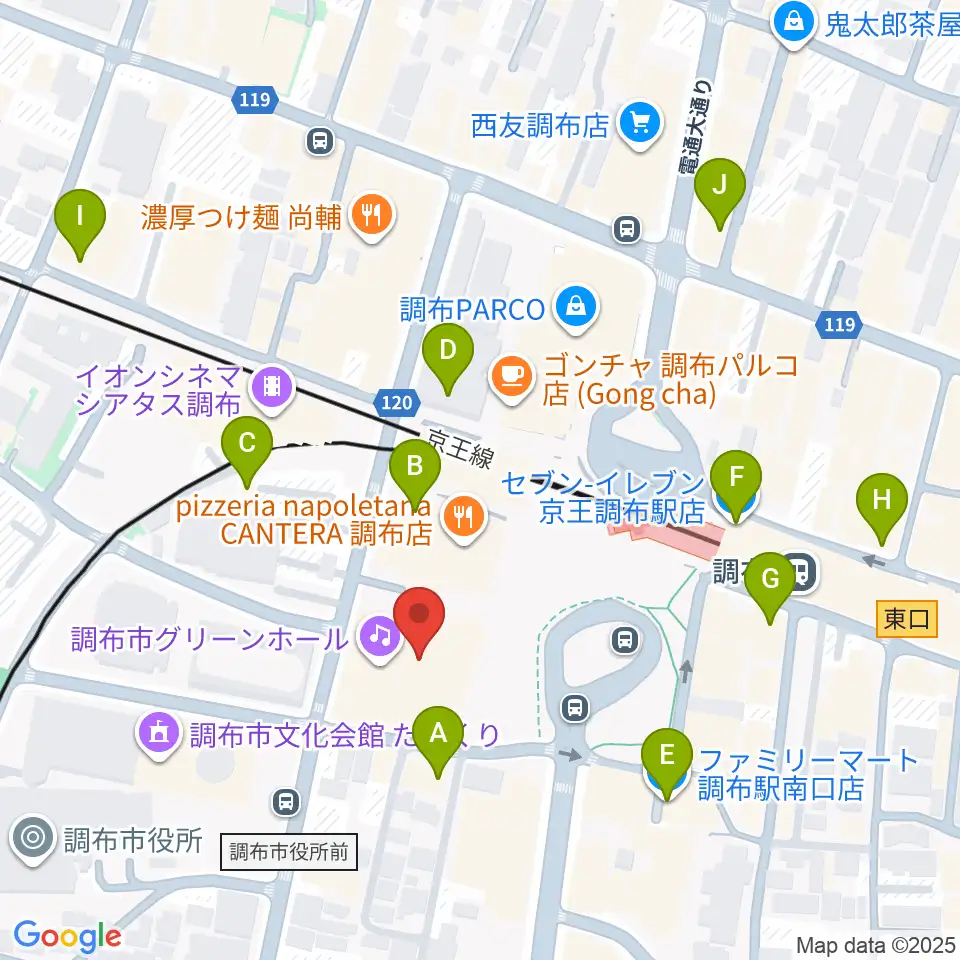 調布市グリーンホール周辺のコンビニエンスストア一覧地図